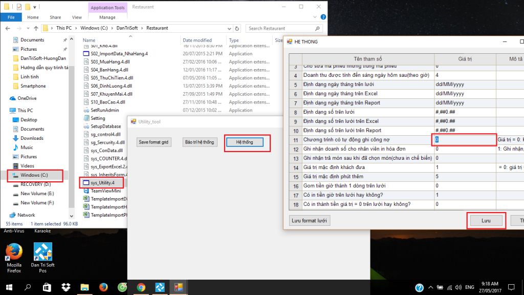 Vào thư mục RUN của Dân Trí Soft thông thường là vào ổ đĩa C>>DanTriSoft>>Restaurant>> tìm file sys_Utility.4, bạn nhấp double vào file này để mở lên cửa sổ. Tại cửa sổ này bạn nhấn vào nút Hệ thống, sẽ mở ra cửa sổ khai báo thông tin hệ thống.